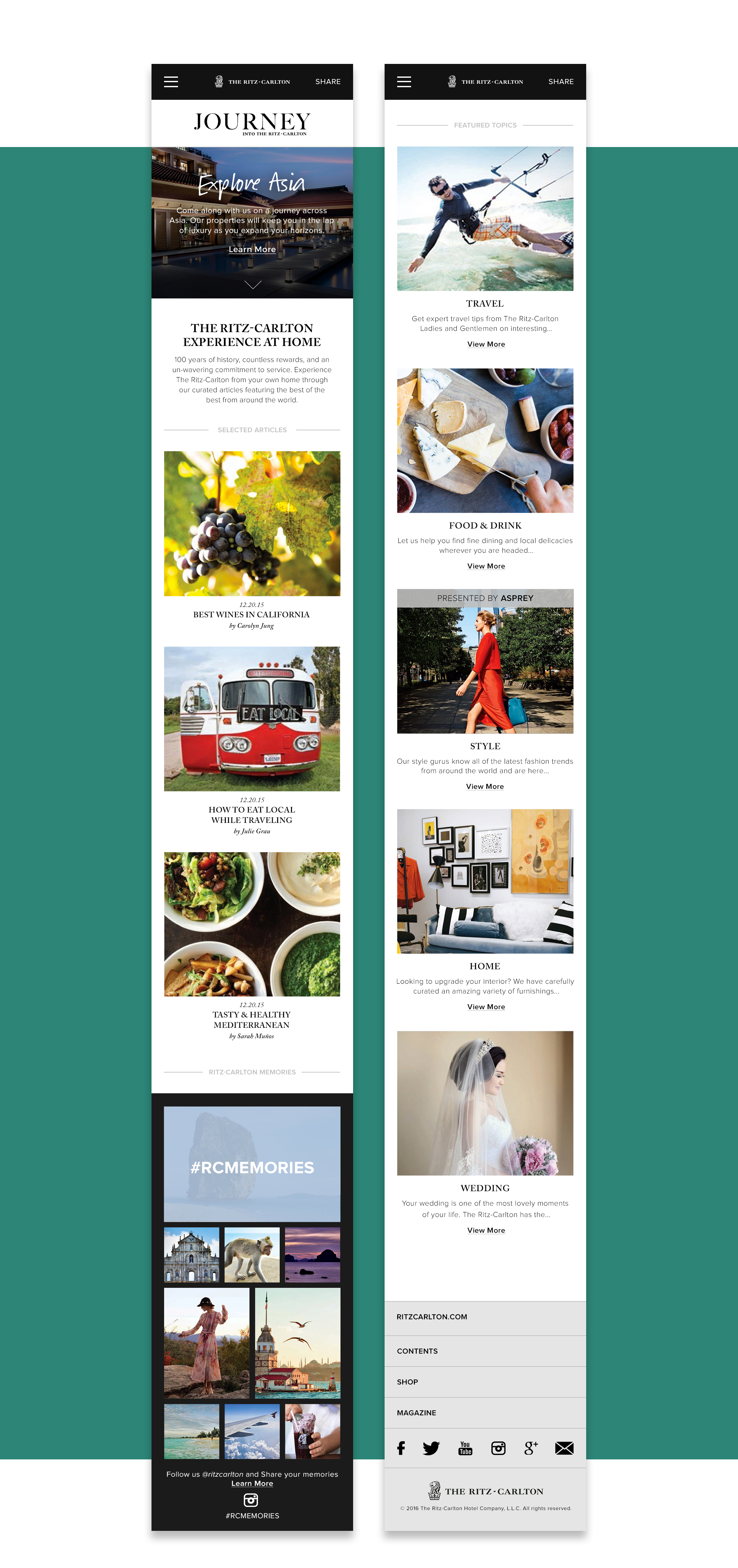 The Ritz-Carlton provides a monthly subscription to "The Ritz-Carlton" magazine. The magazine contains traveler insight, destination guides, offers and much more. Client wanted to create a content hub which would compliment the magazine content. Razorfish lead the creative for this effort and the creative team worked closely with the client to come up with a solution that best suited their needs.